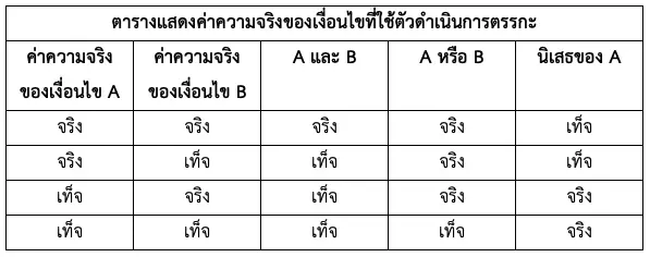 เงื่อนไขบางเงื่อนไขอาจประกอบด้วยเงื่อนไขย่อยหลายเงื่อนไข และแต่ละเงื่อนไขมักเชื่อมด้วยตัวดำเนินการตรรกะ “และ : AND” , “หรือ : OR” แล้วก็ “นิเสธ : NOT” ดังตารางต่อไปนี้