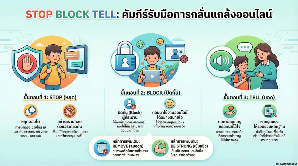 หลักการ STOP BLOCK TELL เป็นเครื่องมือง่าย ๆ ที่ช่วยให้เด็กและเยาวชนรับมือกับการถูกกลั่นแกล้งบนโลกออนไลน์ได้อย่างมีประสิทธิภาพ มีรายละเอียดดังนี้: