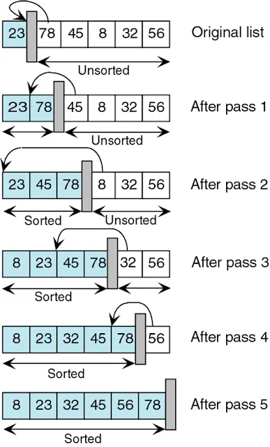 ภาพแสดงขั้นตอนการทำงานของการเรียงลำดับแบบเลือก โดยสีเหลือง คือ เรียงเรียบร้อยแล้ว , สีแดง คือ ค่าที่น้อยที่สุดในปัจจุบัน และสีฟ้า คือ ค่าที่กำลังพิจารณา
